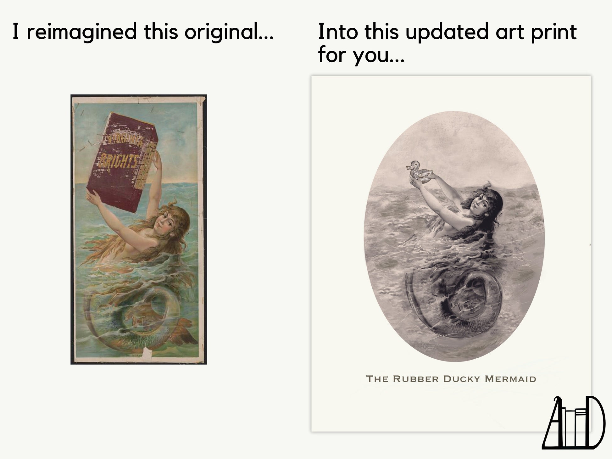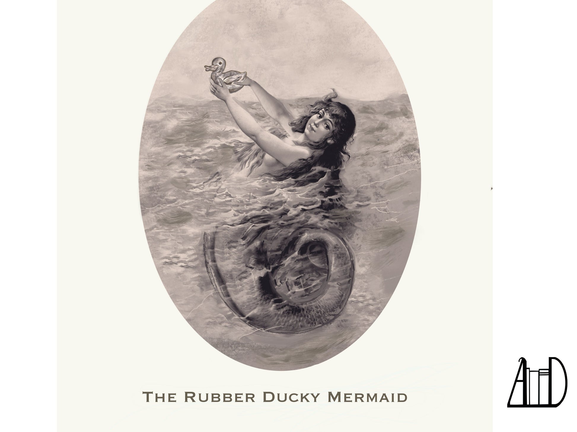 You'll get an art print of a sepia-toned mermaid in the ocean holding a rubber ducky. The mermaid portrait falls within an oval with a white/cream border. That is a flat print with the text "The Rubber Ducky Mermaid" appearing on the oval cream-colored border. **There is no separate mat.**