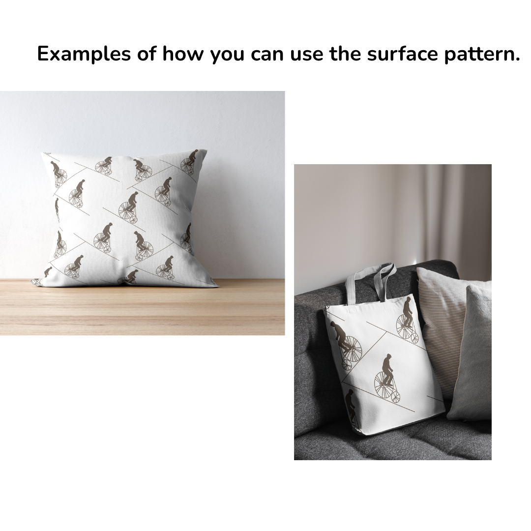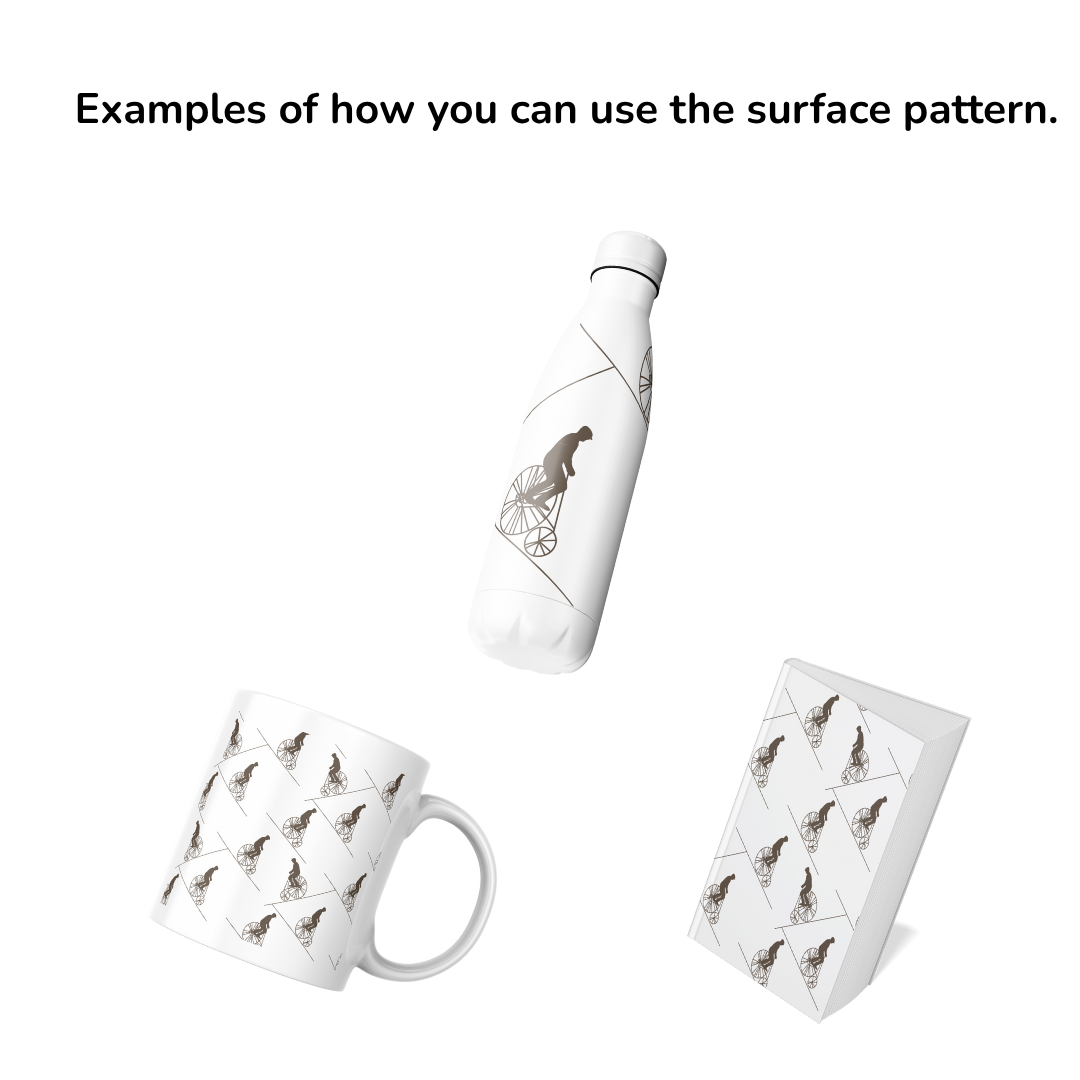 Fun seamless pattern of a man on an old-fashioned bicycle, also called a penny-farthing. The pattern is hand-drawn by me. I did not use AI in its creation.